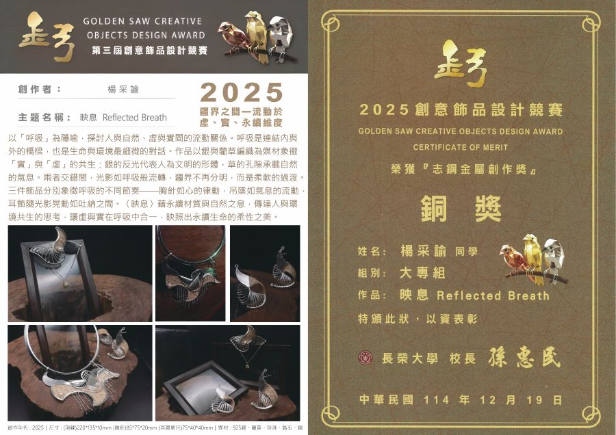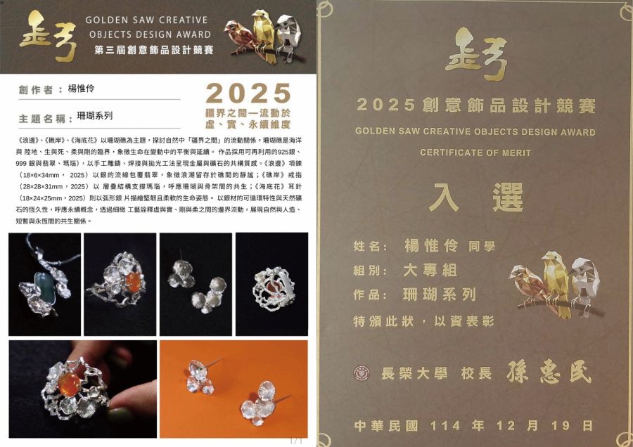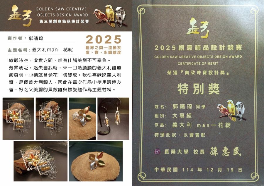 【榮譽榜】恭喜本系吳耀龍、楊采諭、郭晴琦、楊惟伶等四人榮獲2025 第三屆金弓創意飾品設計競賽