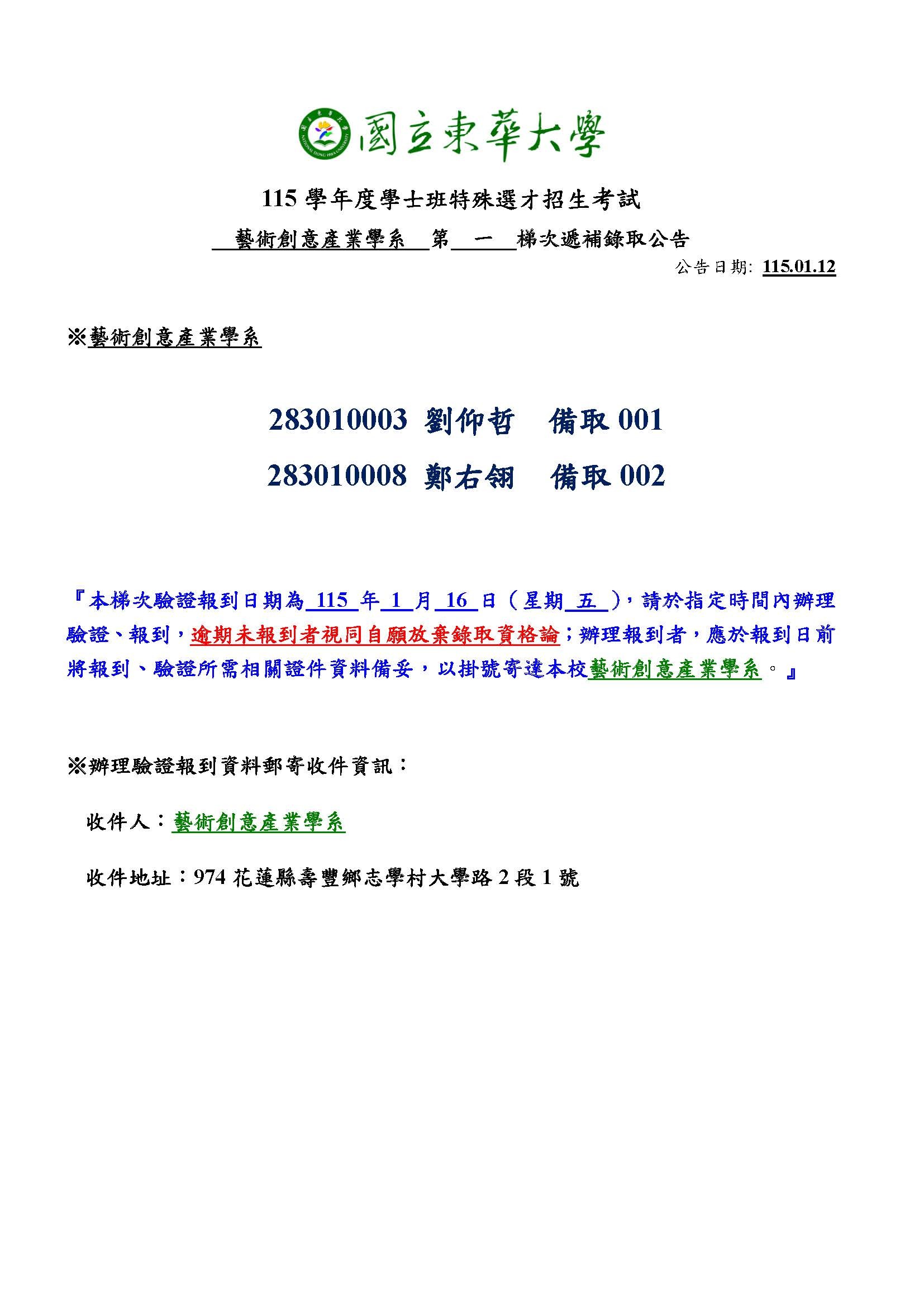 【招生訊息】115藝創系特殊選才招生考試第一梯次遞錄取補公告(1150112公告)